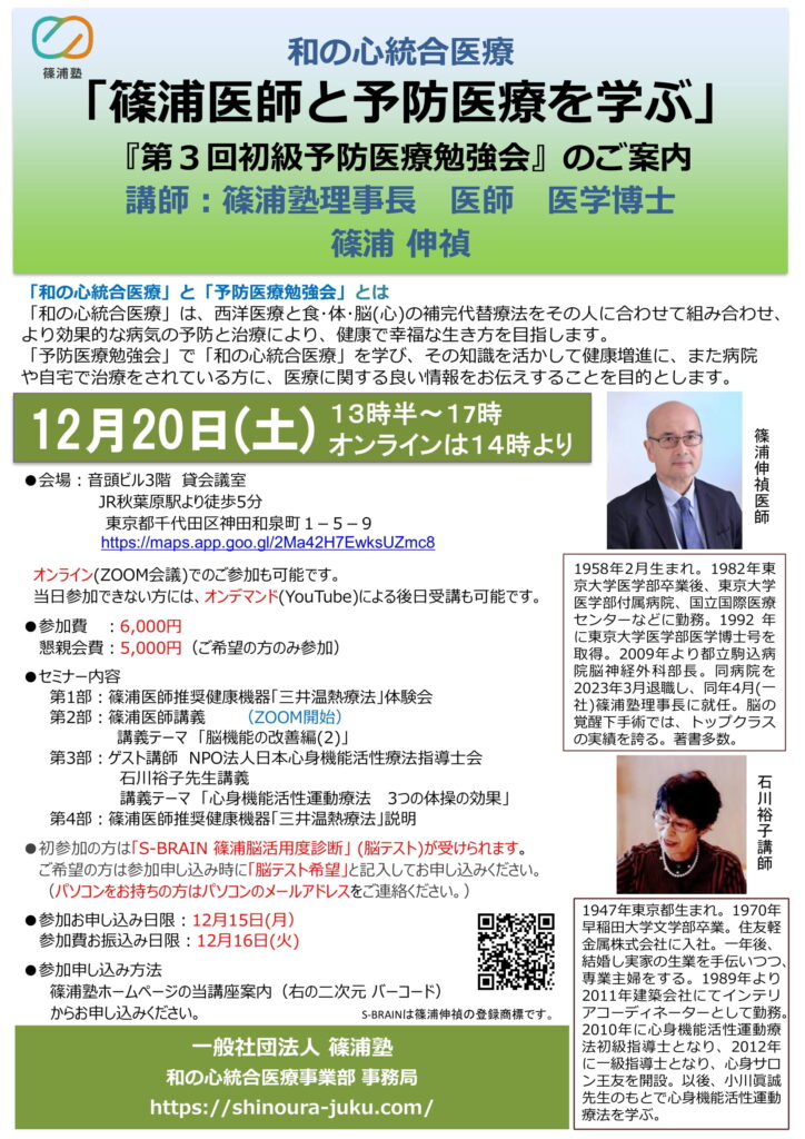 (篠浦医師 医療相談・継続サポート利用者(患者目線の会) の方、初級予防医療勉強会復習受講の会員の方は、会員サイトからお申し込みください)